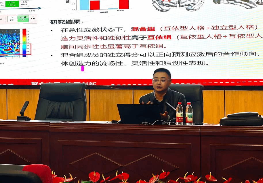 段海军教授从自身的科研生涯故事开场,迅速拉近了与听众的距离。报告中,他不仅系统论述了“压力影响个体与团体创造力的神经机制”,还深入浅出地介绍了其团队采用的多模态研究范式,从心理——行为问题到神经生理机制,从机制研究到心理行为干预,段海军教授向在场师生介绍了一个完整的研究闭环,并系统性地阐释了压力在个体创造性问题解决过程中起削弱作用的神经生理机制、作用和干预方法。