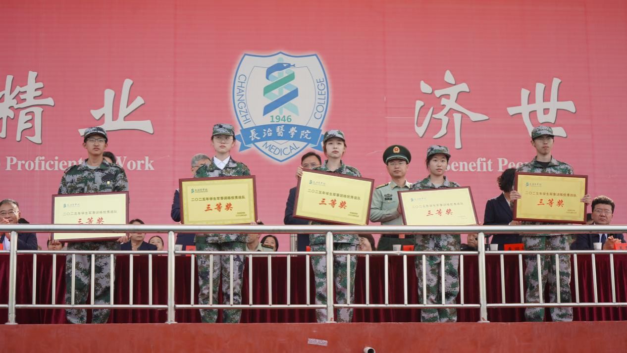 随后,2025级新生以连队为单位进行了分列式汇报表演。22个连队步伐整齐、口号嘹亮、精神饱满,展现出良好的军事素养和昂扬斗志。紧接着,学生方队依次进行了擒敌拳、匕首操表演,动作刚劲有力、连贯娴熟;退役大学生教官进行了队列动作示范表演,展现出过硬的军事作风;教官与学生联合开展的战地救援演练,模拟实战环境,流程专业有序,体现了我校医学特色与军事训练的深度融合。