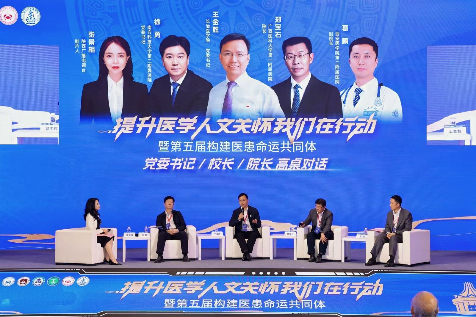 在大会高校党委书记、校长、院长高桌对话环节,王金胜围绕医学人文建设标准与考核指标、人文关怀实践路径、医患关系优化策略等关键议题,详细介绍了我校“四级联动、五全覆盖、六位一体”的医学人文教育创新模式。该模式立足医学人才培养本质,全方位融入人文素养培育,得到了与会嘉宾的高度认可与广泛赞誉,充分展现了学校在医学人文教育领域的深厚积淀与实践成果。