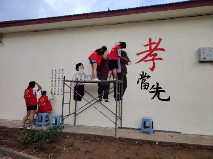 成员们先用粉笔勾画底稿,细致地描绘老人、孩童的形象及书法文字轮廓。接着,进行涂色工作,逐步完成墙画的呈现。以“孝当先”三个字为主题,墙画中的人物和文字栩栩如生,寓意深刻。