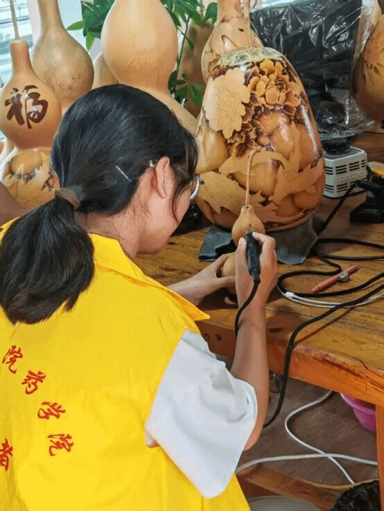 师徒协作完成集体作品《青春印记》。冯师傅添上采蜜蜂时说:“传统技艺需要年轻人像蜜蜂传粉般,把文化传播更远。” 电烙笔的焦香与葫芦田清香交织,绘出非遗传承图景。