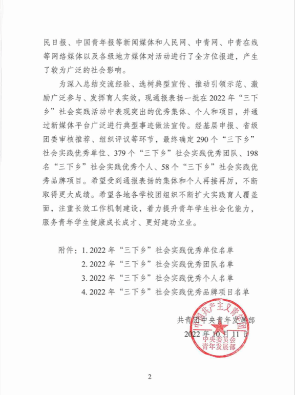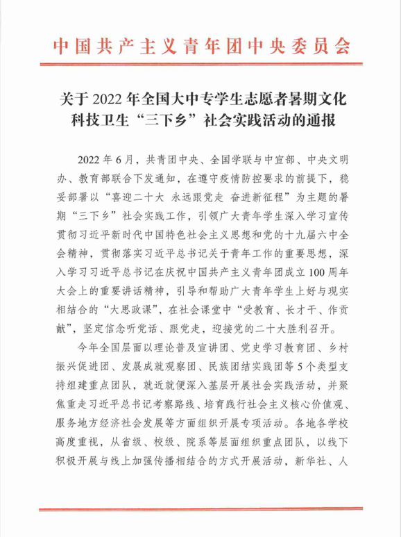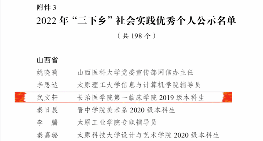 据共青团中央《关于2022年全国大中专学生志愿者暑期文化科技卫生“三下乡”社会实践活动的通报》获悉,我校第一临床学院2019级教改1901班武文轩荣获2022年全国暑期“三下乡”社会实践活动优秀个人荣誉。