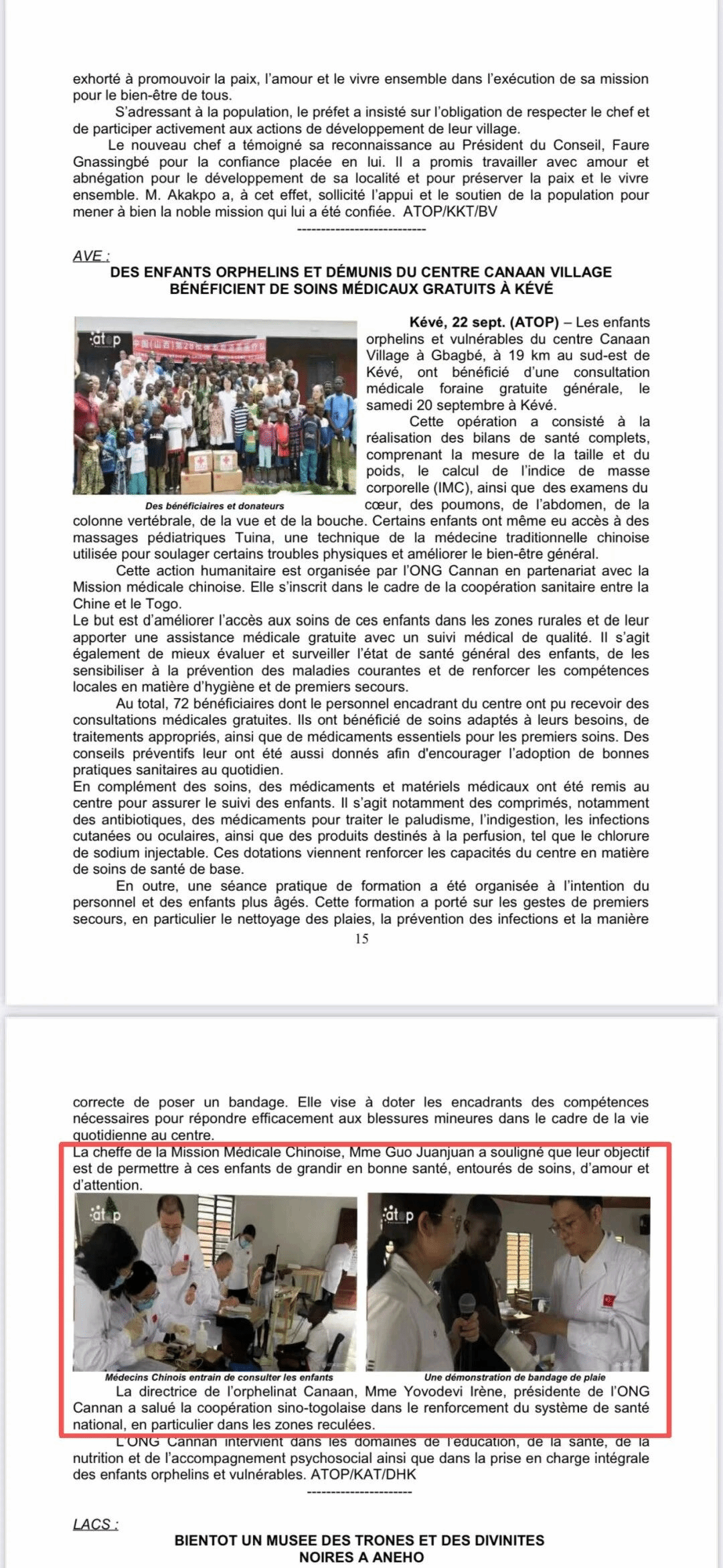 近日,中国(山西)第28批援多哥洛美医疗队在首都洛美Bagabé孤儿院开展的“携手共创儿童美好未来”健康义诊及药物捐赠活动,获多哥通讯社、新华社等中外权威媒体广泛报道,展现了中非友好合作的生动实践,彰显了附属医院援外医疗工作的社会影响力。
