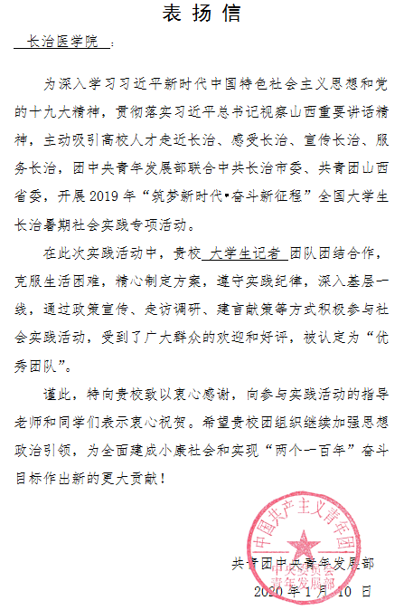 近日,团中央对2019年“筑梦新时代•奋斗新征程”全国大学生长治暑期社会实践专项活动进行表彰,我校大学生记者团社会实践队、爱心医疗服务队荣获“优秀团队”称号,“荣药梦之队”领队药学1702班左娟娟同学荣获“优秀个人”称号。我校2019年暑期“三下乡”社会实践活动以“青春心向党 建功新时代”为主题,按照“目标精准化、工作系统化、实施项目化、传播立体化”和“按需设项、据项组团、双向受益”的原则,结合实际,组建了理论普及宣讲团、...